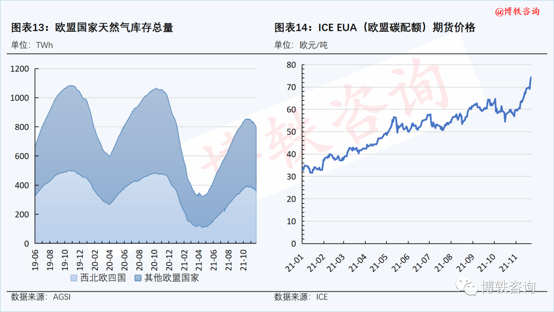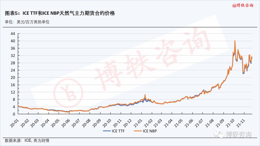 本周,在供應端,美國政府(fǔ)於當地時間11月22日表(biǎo)示,美國將(jiāng)繼續針對(duì)“北溪-2”管道項目實施製裁,該消息使得本已麵(miàn)臨供應(yīng)短缺的歐(ōu)洲天(tiān)然氣(qì)市場雪上加(jiā)霜(shuāng)。在需求端,天氣預計,西北歐地區氣溫將持續下滑,居(jū)民采暖需求預(yù)期(qī)提升;而由於風力持續偏低,電廠對天(tiān)然氣的采購需求維持在高位。加之一個月以來碳價的(de)強勢上漲,西北歐天(tiān)然氣期貨價格仍強勢運行。