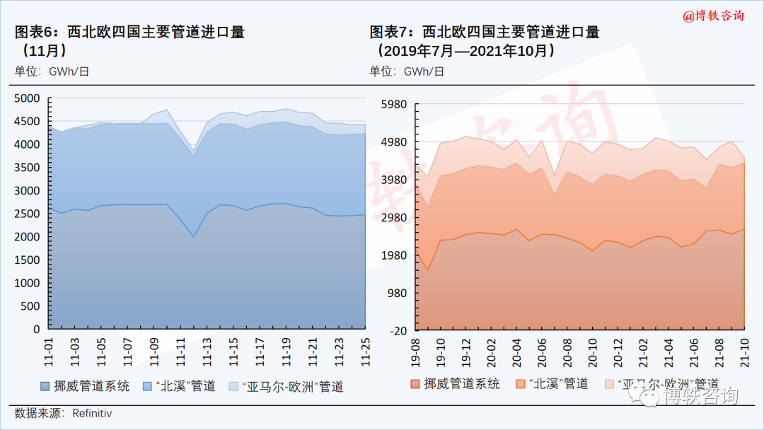 俄氣方麵,“亞馬爾-歐(ōu)洲”管道氣量有所(suǒ)下滑,本周四(11月(yuè)25日)的供應量為199GWh/日;“北溪”管道氣保持穩定,本(běn)周四(11月25日)的供應量為1754GWh/日。