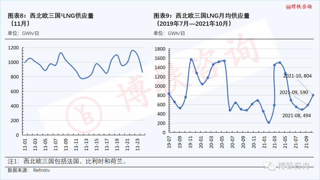 LNG供應量保持在高位。本周(zhōu)四(11月25日),西北歐三國的LNG供應量(liàng)為922GWh/日,周環比(11月19日)下降178Wh/日。