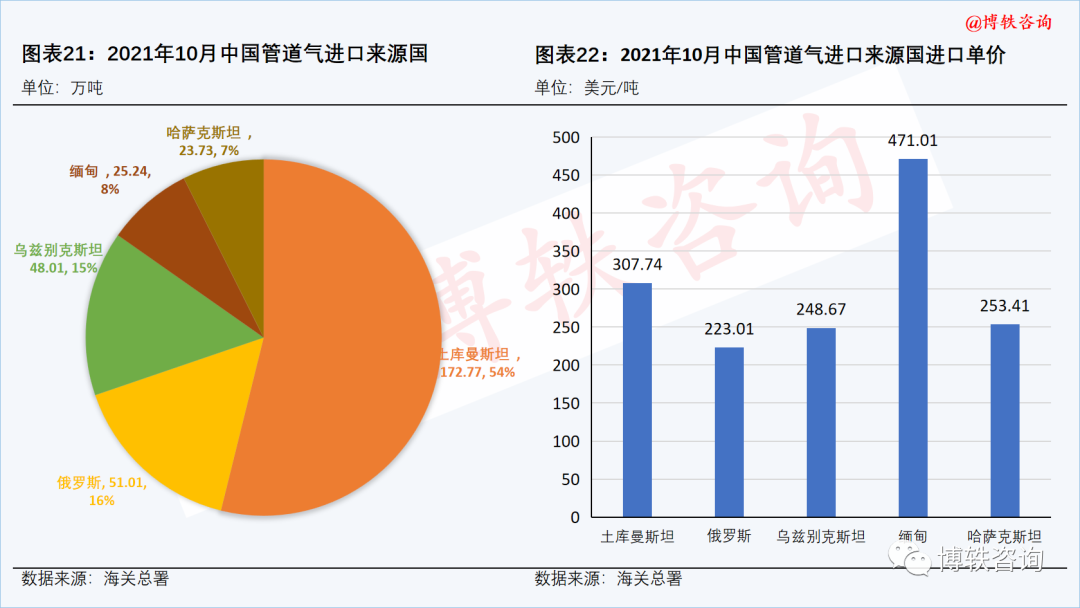 在管道氣方麵,10月份,中國(guó)進口管道氣達320.8萬噸,環比下降17.2%,占當月進口量的34.21%。除烏茲別克斯坦外,中國從其他(tā)各國進口管道氣均較上月有所下滑;當(dāng)月管道氣進口均價為294.25美元/噸。