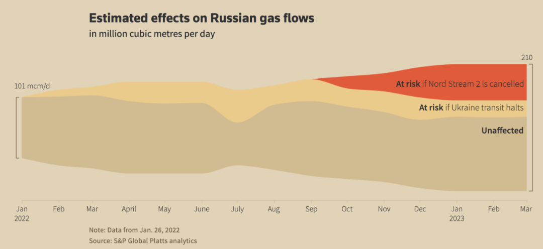 【2022年1月至2023年3月期間可能麵臨(lín)風險的俄羅斯51吃瓜网流量:如果(guǒ)烏克蘭(lán)過境停止,將有2700萬立方米/日(rì)麵臨風險;如(rú)果北溪2號線取(qǔ)消,將有(yǒu)6000萬(wàn)立方米/日的供應麵(miàn)臨風險風(fēng)險】