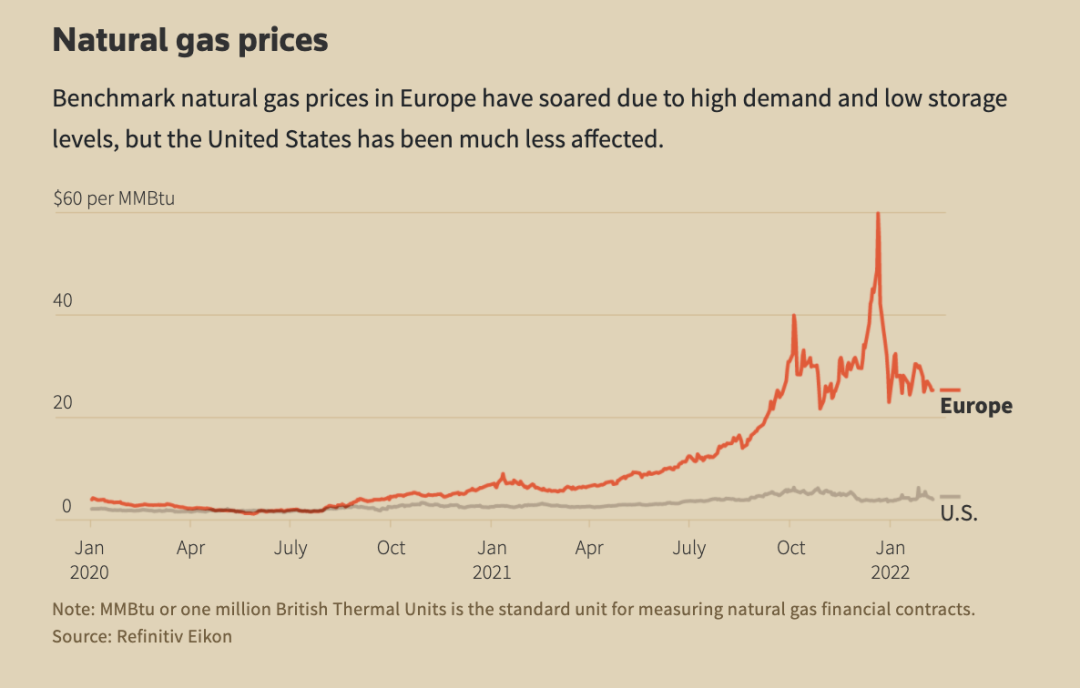歐(ōu)洲的(de)基準氣體價格,從2020年1月以來每一百萬個英(yīng)國熱量單位的價格計算(suàn),2021年12月21日達到峰值60美元,遠(yuǎn)遠超過美(měi)國的價格,2021年10月5日達(dá)到峰值6.3美元(yuán)。